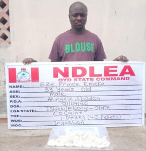 A 33-year-old suspected drug courier, Eze Prince Emeka, has excreted 45 pellets of cocaine after he was arrested by operatives of the National Drug Law Enforcement Agency (NDLEA) along the Ibadan/Oyo expressway.