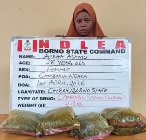 Aisha was arrested along the Gamboru Ngala Road on Wednesday, April 1, in possession of 4.3 kilograms of Colorado, a potent synthetic strain of cannabis.