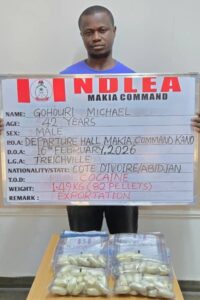 An Ivorian national, Michael Gohouri (also known as Anunwa Onyinye Michael), has excreted 1.49 kilograms of cocaine (82 wraps) at the Mallam Aminu Kano International Airport (MAKIA) in Kano State.