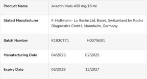 According to NAFDAC, the Marketing Authorisation Holder (MAH), Roche, reported that an oncologist from a local hospital expressed concern about potentially counterfeit Avastin vials (400 mg/16 ml), batch numbers K1830T71 and H0375B01.