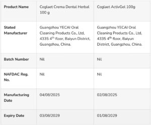 “Upon investigation, a team of PMS officers visited the outlet where the products were being sold. They discovered two suspected unregistered and counterfeit Colgate toothpaste products, branded as Coglaet ActivGel 100g and Coglaet Herbal 100g, available for sale.