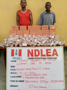 The statement added: “In Benue State, a female suspect Janet Iornongu was arrested at Yes Ikyuan village, Guma LGA with 210kg skunk, while a total of 254.5kg of same psychoactive substance was seized from Anita Job along Abaji-Toto road, FCT on Thursday 22nd January. A total of 39,800 pills of tramadol 225mg were recovered from two suspects: Hamisu Misbahu and Chima Obi at Alaba Rago, Mile 2 area of Lagos on Monday 19th January.