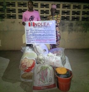 Elsewhere (Ekiti), NDLEA operatives apprehended 72-year-old Afolalu Joseph at his 15 Aramoko road, Mushin, Ilawe-Ekiti and Abu Bunmi (alias Go Slow), 45, at New Jerusalem area, Erijinyan road, Ilawe-Ekiti for illicit drug dealing on Saturday, January 24. A total of 62 kilograms of skunk were recovered from the duo.