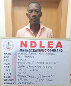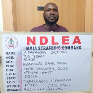 In another operation, NDLEA operatives intercepted two passengers — Adediran Adedoyin and Afatakpa Ochuko at the Murtala Muhammed International Airport (MMIA) Ikeja, Lagos, on Tuesday, January 20. The duo were heading to Istanbul, Turkey, aboard a Turkish Airlines flight with a total of 3,990 pills of tapentadol 250mg and tramaking 225mg concealed in food items packed in their bags.