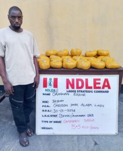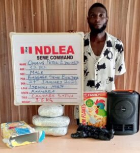 The statement added: “While Oragwan Ekene was arrested on Friday 30th January at Okeyson park, Alaba, Lagos, with 15.5kg skunk heading to Onitsha, Anambra State with the illicit consignment, 3.5kg of same psychoactive substance was recovered from a sound system and two packets of cereal found in the luggage of Omang Peter Edward at the arrival tarmac of Seme border, Badagry on Tuesday 27th January. The suspect was coming from Cotonou, Benin Republic into Lagos.”