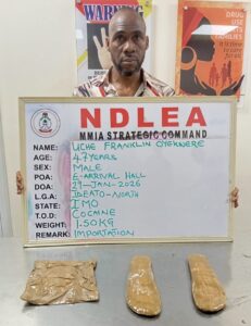 Operatives of the National Drug Law Enforcement Agency (NDLEA) have arrested a Brazil-based Nigerian businessman, Uche Franklin Onyekwere, for concealing 1.60kg of cocaine in his private parts and the soles of his footwear at the arrival hall of the Murtala Muhammed International Airport (MMIA), Ikeja, Lagos.