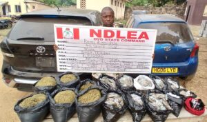 Elsewhere (Oyo State), raids across different locations led to the seizure of dangerous illicit drugs and the arrest of notorious dealers, including 45-year-old Remi Bamidele (alias ‘Aluko the Mafia’) at Sasa, Ibadan, where a total of 10.696 kilograms of Colorado, Scottish Loud, Ghana Loud, Canadian Loud, and skunk (all strains of cannabis) were seized.