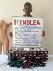 In another successful interdiction operation in Akwa Ibom State, NDLEA operatives on patrol along Oron-Ibaka road in Oron LGA on Friday, January 9, intercepted a 37-year-old businessman Ani Onyebuchi Romans while travelling with full body mannequins for his clothing business in Cameroon.