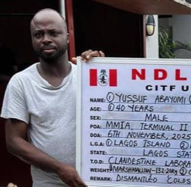 Operatives of a Special Operations Unit of the National Drug Law Enforcement Agency (NDLEA) have arrested a wanted drug kingpin identified as Yussuf Abayomi Azeez at the Murtala Muhammed International Airport (MMIA), Ikeja, Lagos while on his way to Saudi Arabia for Umrah, a holy pilgrimage.