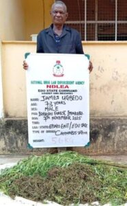 The statement added: “A 73-year-old grandpa James Ugbedo was on Friday 7th November arrested in a cannabis plantation at Igbeshi forest, Imiakebo, Etsako East LGA, Edo State where 1,459.75kg skunk was destroyed and 5.6kg of same substance evacuated, while 70-year-old grandma Mrs. Comfort Odudu was nabbed at Onopa, Yenagoa, Bayelsa State with 5kg skunk on Tuesday 4th November.”