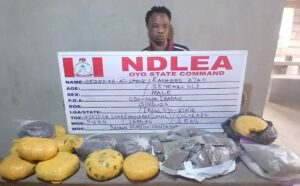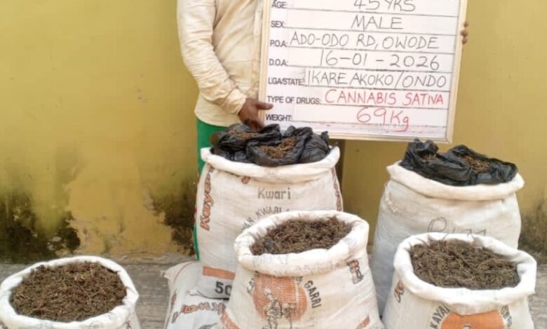 “Kanmo-Kanmo, who is notorious for drug trafficking, evading arrest and mobilizing armed thugs against security agents was on Friday 16th January 2026 tracked to his hideout in Owode town, Ogun State by tactical teams of the Agency following credible intelligence. During the clinical operation, the suspect was found in possession of 69 kilograms of skunk, a strain of cannabis.