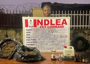 In the Federal Capital Territory, Abuja, operatives on Friday, January 16, tracked and arrested a 44-year-old lady Yinka Agboola following intelligence on her online sale of illicit substances. At the time of her arrest, 2.2kg skunk and litres of cannabis oil which she produces in her kitchen and sells through online advertisement were recovered from her home at the Kaura district, Abuja.
