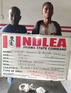 “An ex-convict, Gaddafi Ammani, 26, was arrested with various quantities of skunk and exol-5 pills along his accomplice Ahmed Sani, 32, at Nassarawa GRA, Ringim LGA Jigawa State on Saturday 17th January. Before Gaddafi’s arrest, he attempted to escape by climbing the roofs of many houses in his bid to escape. He was armed with a machete which he used to threaten NDLEA operatives and even inflicted injury on one of the officers.”