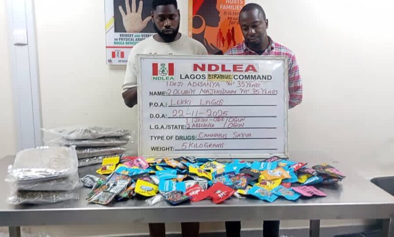 Babafemi disclosed that NDLEA officers stormed the duo’s apartment on Ojulari Street, Ikate area of Lekki, where they recovered about five kilograms of Canadian Loud, a potent strain of cannabis, along with large quantities of colourful designer sachets printed with images and labels of cookies and snacks, used to package the drugs in retail quantities.