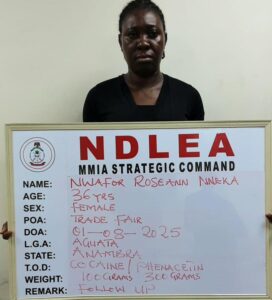 In a related development, NDLEA operatives on Friday, August 1, 2025 arrested a businesswoman identified as Mrs. Nwafor Roseann Nneka at her shop within the Trade Fair Complex, in the Ojo Local Government Area of Lagos for her involvement in drug trafficking.