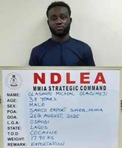 According to a statement made available to ThelensNG by the Agency’s Director of Media and Advocacy, Femi Babafemi, the trio of Olasupo Michael Oladimeji, Muaezee Ademola Ogunbiyi, and Shola Adegoke, who are leaders of one of the cartels, were arrested following the seizure of 17.9 kilograms of cocaine concealed in textile materials and local charms destined for Sydney, Australia, at the export shed of the MMIA on August 26, 2025.