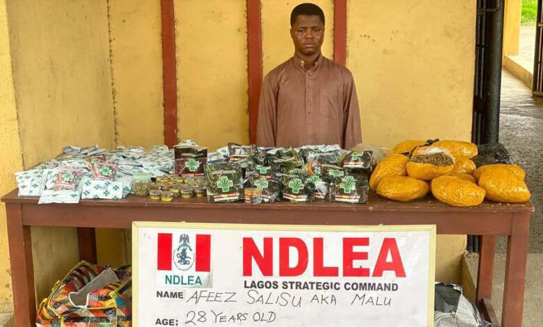 According to a statement made available to ThelensNG by NDLEA‘s Director of Media and Advocacy, Femi Babafemi, on Wednesday, the illicit drugs, including Colorado, Arizona, Canadian Loud, and Ghana Loud, were packaged in designer pouches and cups labelled as “medicinal cannabis”, and were recovered from Salisu’s store.