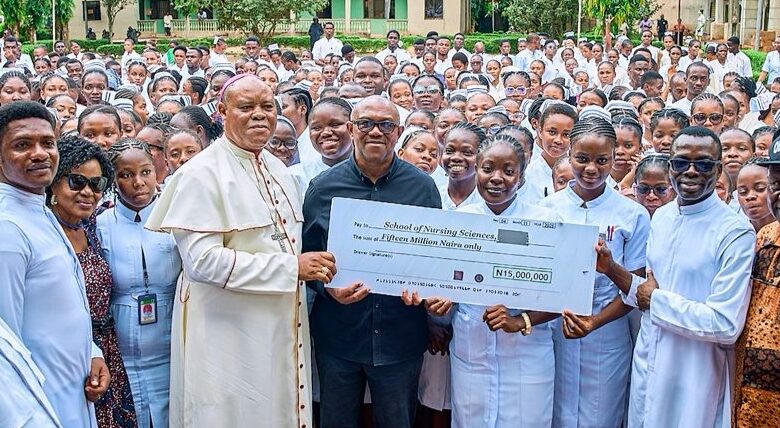 The 2023 presidential candidate of the Labour Party (LP), Mr. Peter Obi, has continued his philanthropy efforts by donating ₦15 million to Our Lady of Lourdes College of Nursing Sciences, Ihiala, Anambra State.