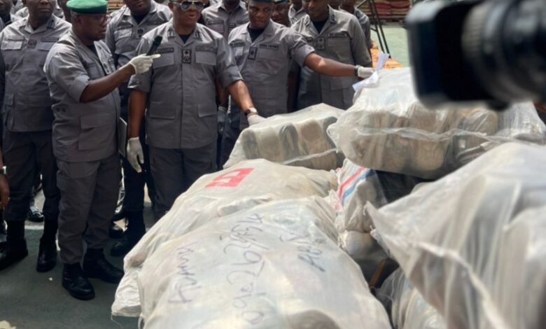 Others are 37 wraps of cannabis sativa (Indian hemp) valued at ₦4,256,156; 15 pieces of codeine syrup worth ₦432,169; 10 packs (250mg) of tramadol with a DPV of ₦17,286,750; 42 sacks of used shoes valued at ₦424,507,242; and 110 cartons of foreign spaghetti worth ₦8,549,888.
