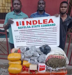 In Bayelsa, three suspects: Friday Elebechi, 35; Tobin Godgift, 30; and Aya Clement, 30, were arrested at Swali jetty, Yenagoa, on Monday, 22nd of September after 12kg of skunk, a strain of cannabis and 50 Diana AAA cartridges were recovered from them.